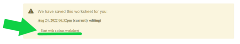 After your initial "first" content submission, the system "remembers" you. It will load your most recent content submission worksheet every time that you attempt a NEW submission. You will need to click "Start with a clean worksheet" (illustrated in the graphic below with the GREEN ARROW) or you will overwrite your previous entry AND no one will be notified of your new content submission.